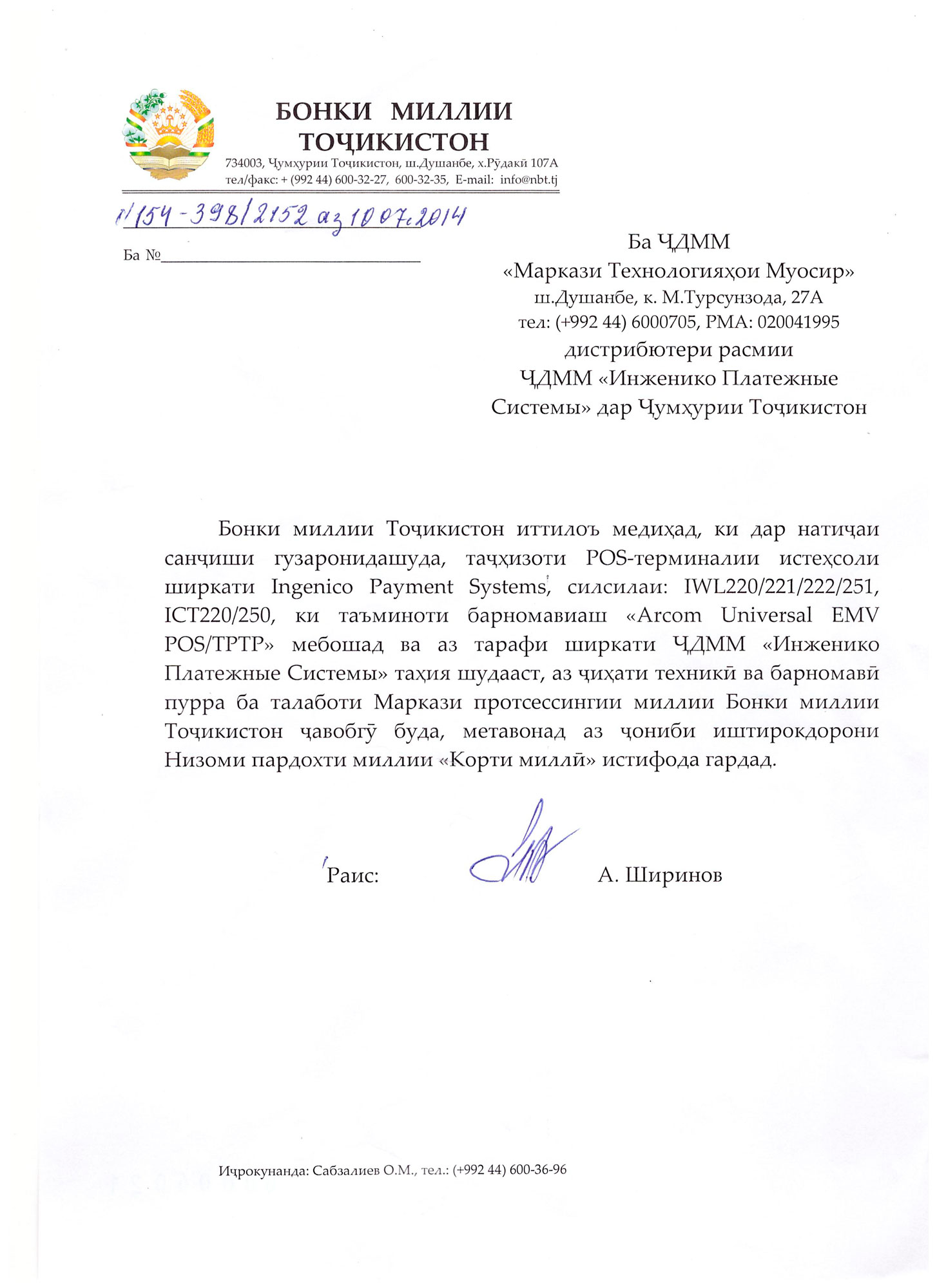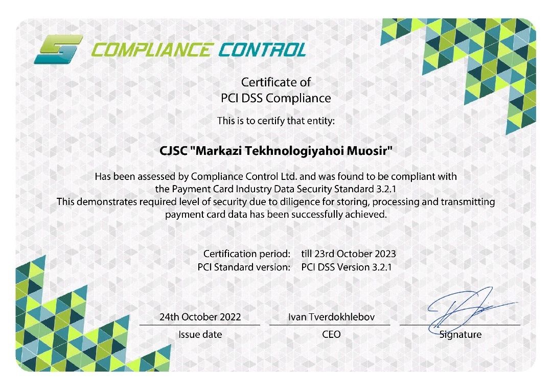 Сертификат от Национального Банка Таджикистана