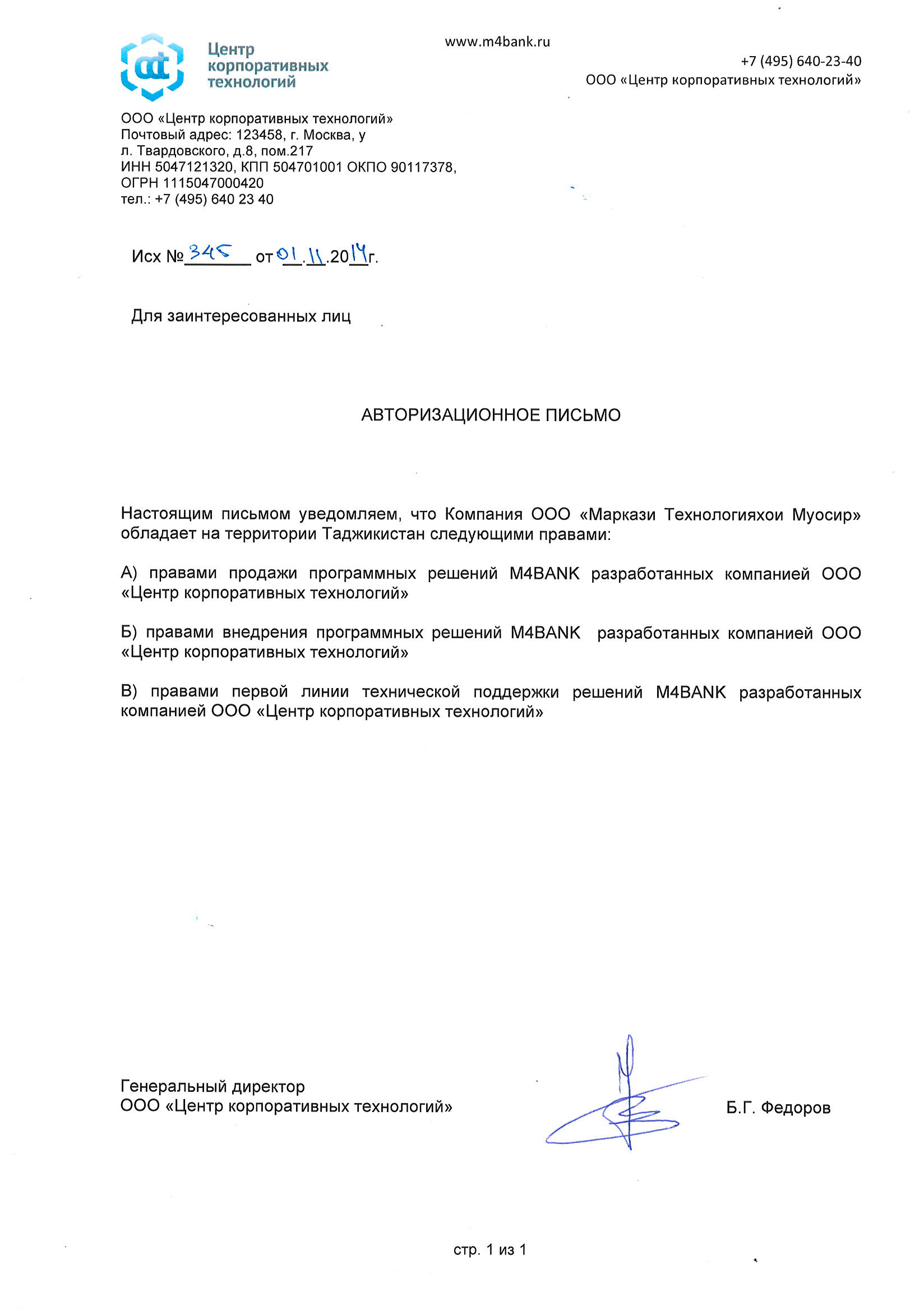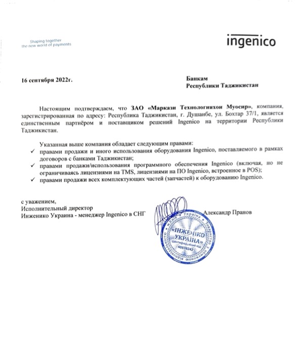 Авторизационное письмо от Ingenico