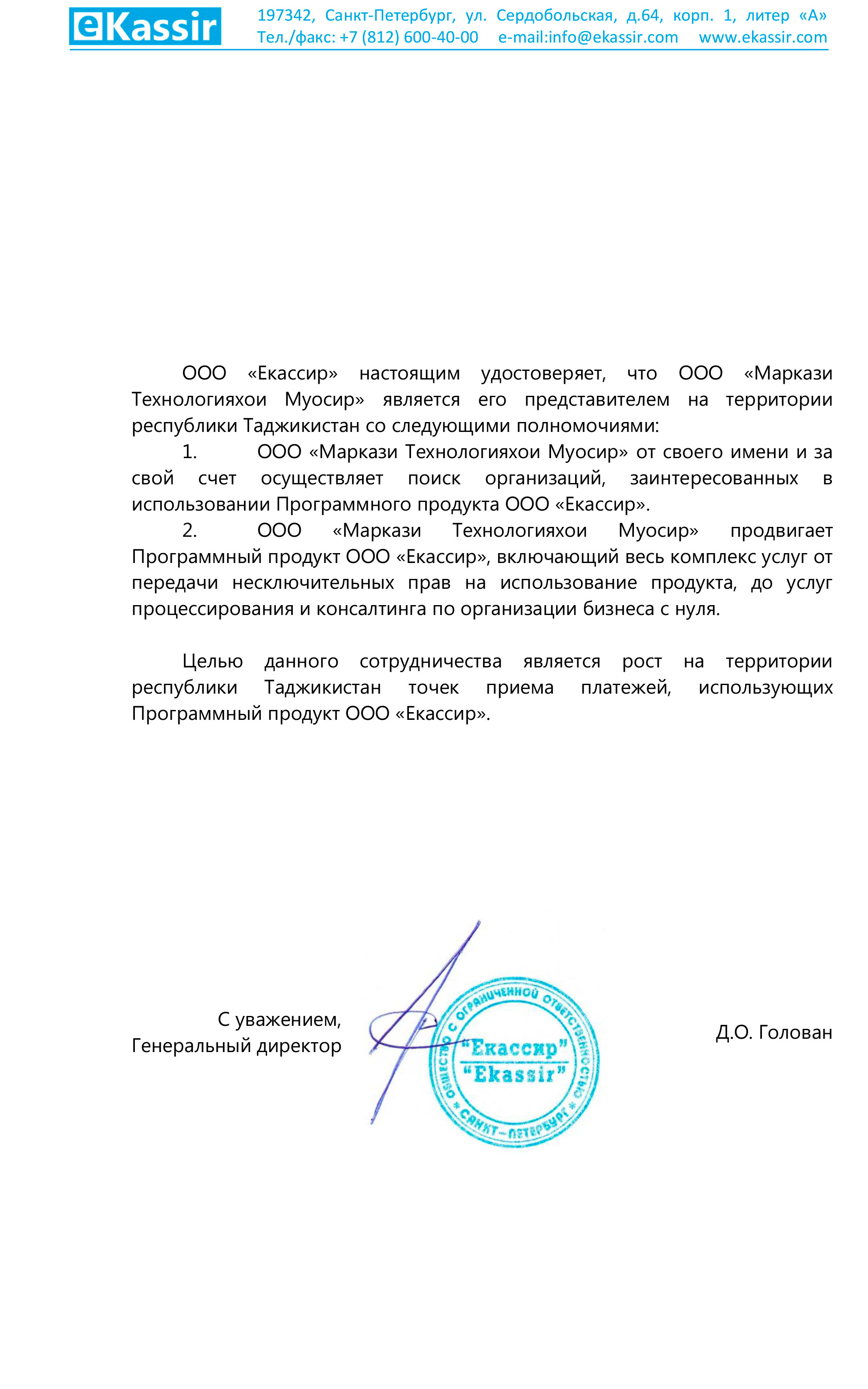 Сертификат представительства от eKassir
